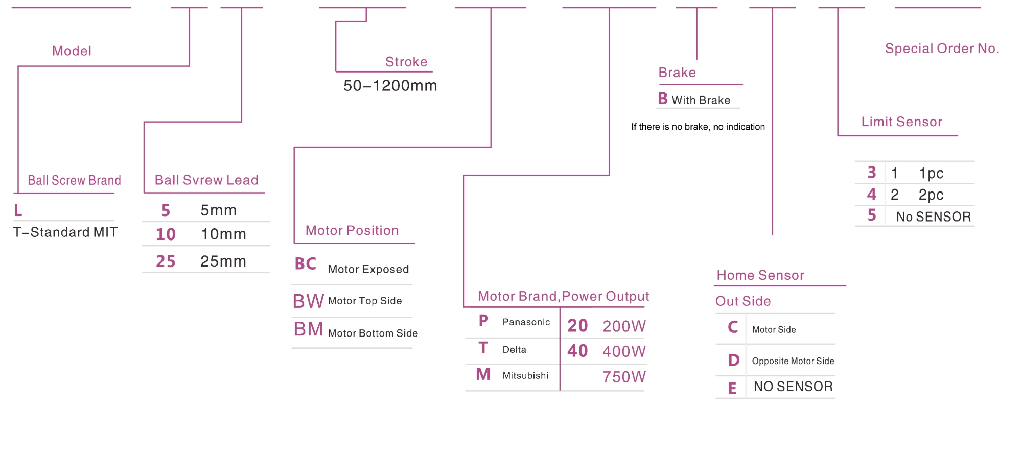 | Gunakan Di Mana | Mod Dipacu | Spesifikasi Model | Output Motor (w) | Lebar (mm) | Kebolehulangan (mm) | Spesifikasi Skru Bola | Muatan Maksimum (kg) | Kelajuan maksimum (mm/s) *1 | ||