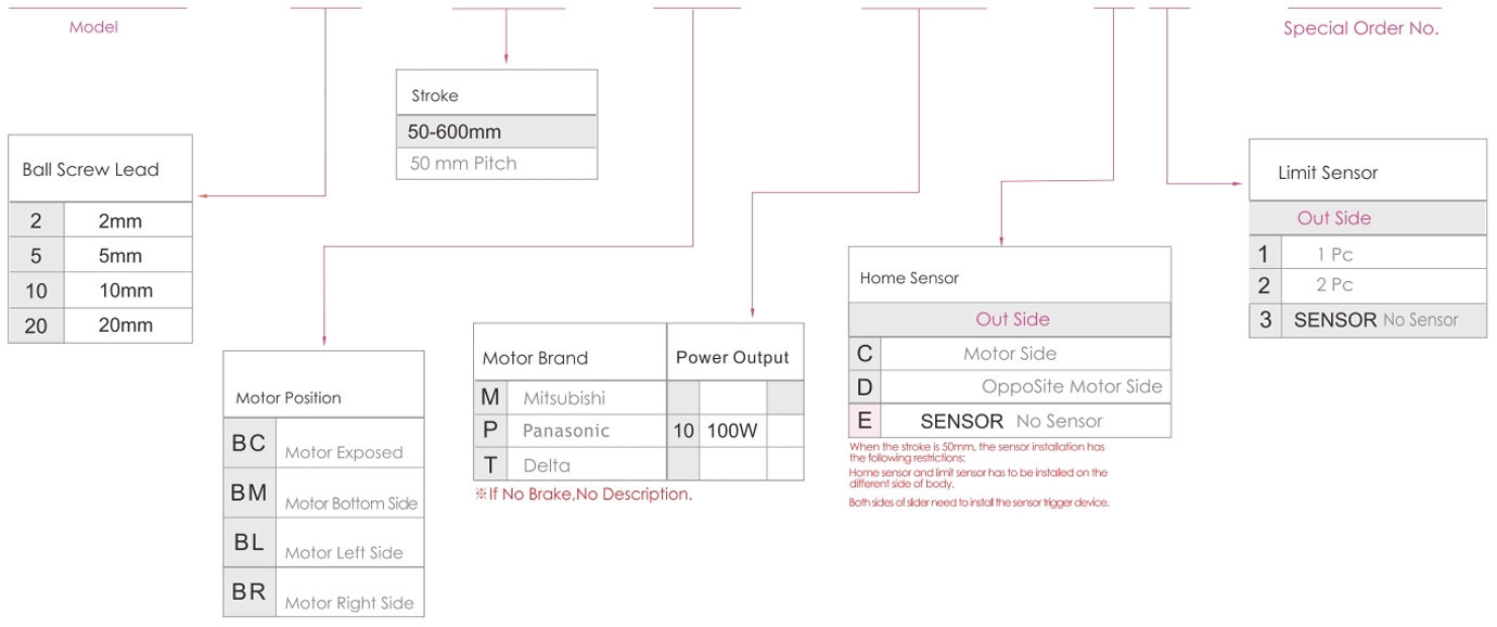 | Gunakan Di Mana | Mod Dipacu | Spesifikasi Model | Output Motor (w) | Lebar (mm) | Kebolehulangan (mm) | Spesifikasi Skru Bola | Muatan Maksimum (kg) | Kelajuan maksimum (mm/s) *1 | ||