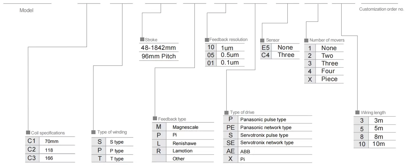 | Gunakan Di Mana | Mod Dipacu | Spesifikasi Model | Spesifikasi Motor | Lebar badan (mm) | Ketinggian badan (mm) | Kebolehulangan (mm) | Tujahan berterusan (N) | Tujahan puncak (N) | lrms(A) | Muatan Maksimum (kg) | Kelajuan maksimum (mm/s) *1 |