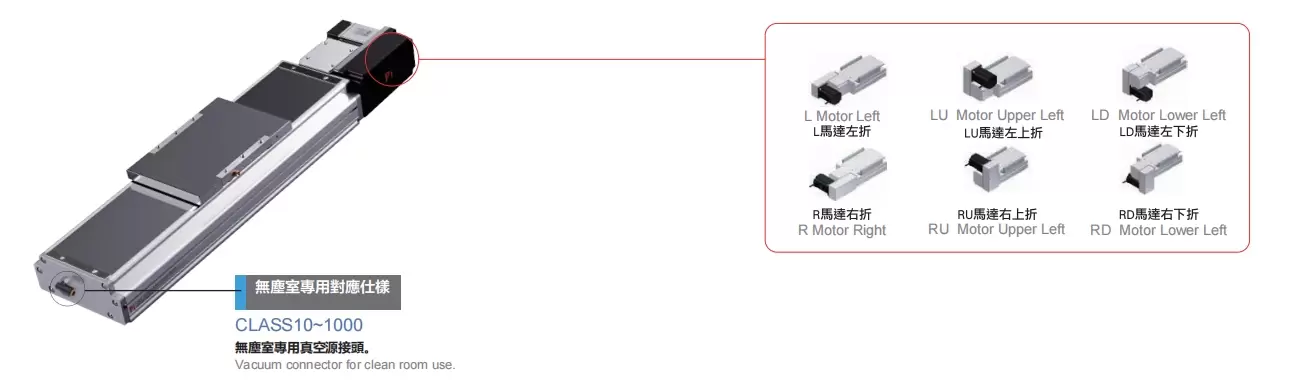 | Gunakan Di Mana | Mod Dipacu | Spesifikasi Model | Mekanisme Pengurang | Output Motor (w) | Lebar (mm) | Ketinggian badan (mm) | Kebolehulangan (mm) | Spesifikasi tali pinggang | Muatan Maksimum (kg) | Kelajuan maksimum (mm/s) *1 | ||