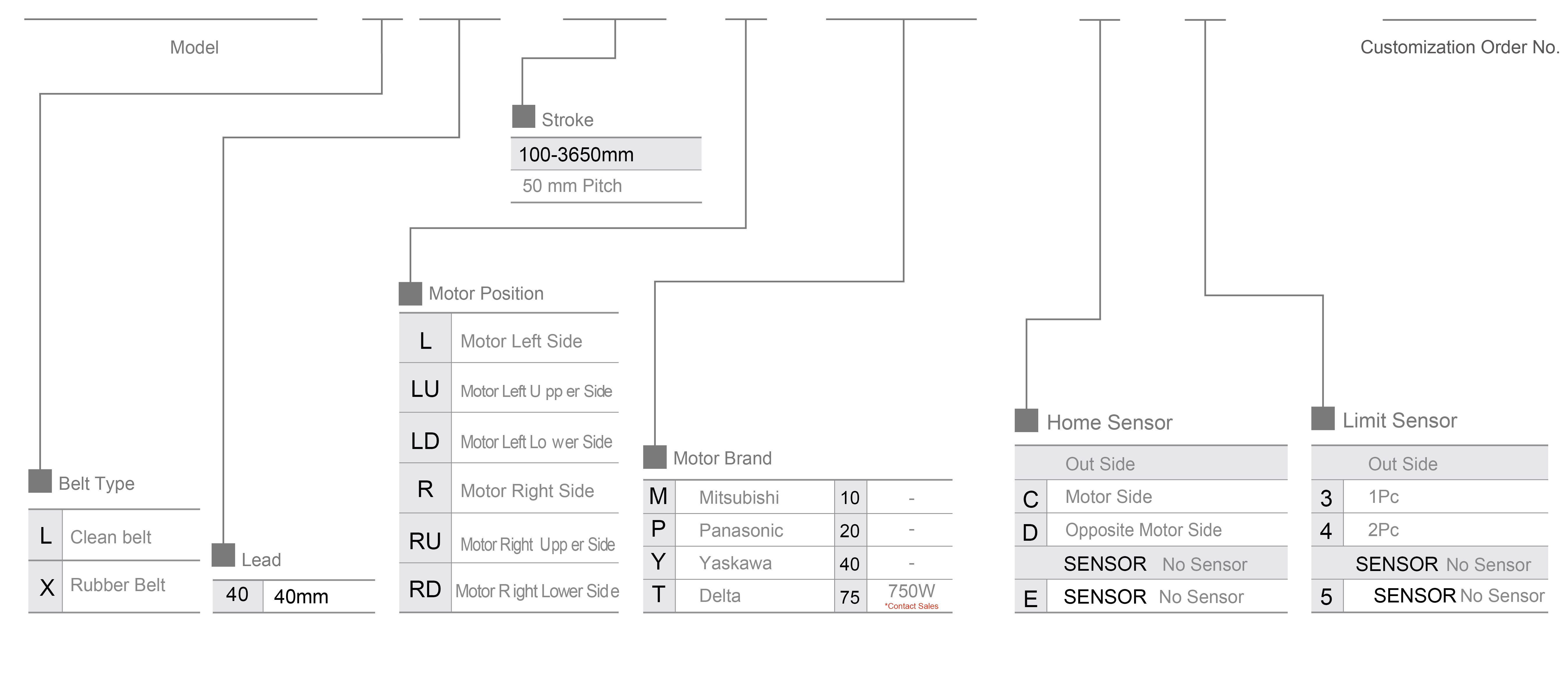 | Gunakan Di Mana | Mod Dipacu | Spesifikasi Model | Mekanisme Pengurang | Output Motor (w) | Lebar (mm) | Ketinggian badan (mm) | Kebolehulangan (mm) | Spesifikasi tali pinggang | Muatan Maksimum (kg) | Kelajuan maksimum (mm/s) *1 | ||