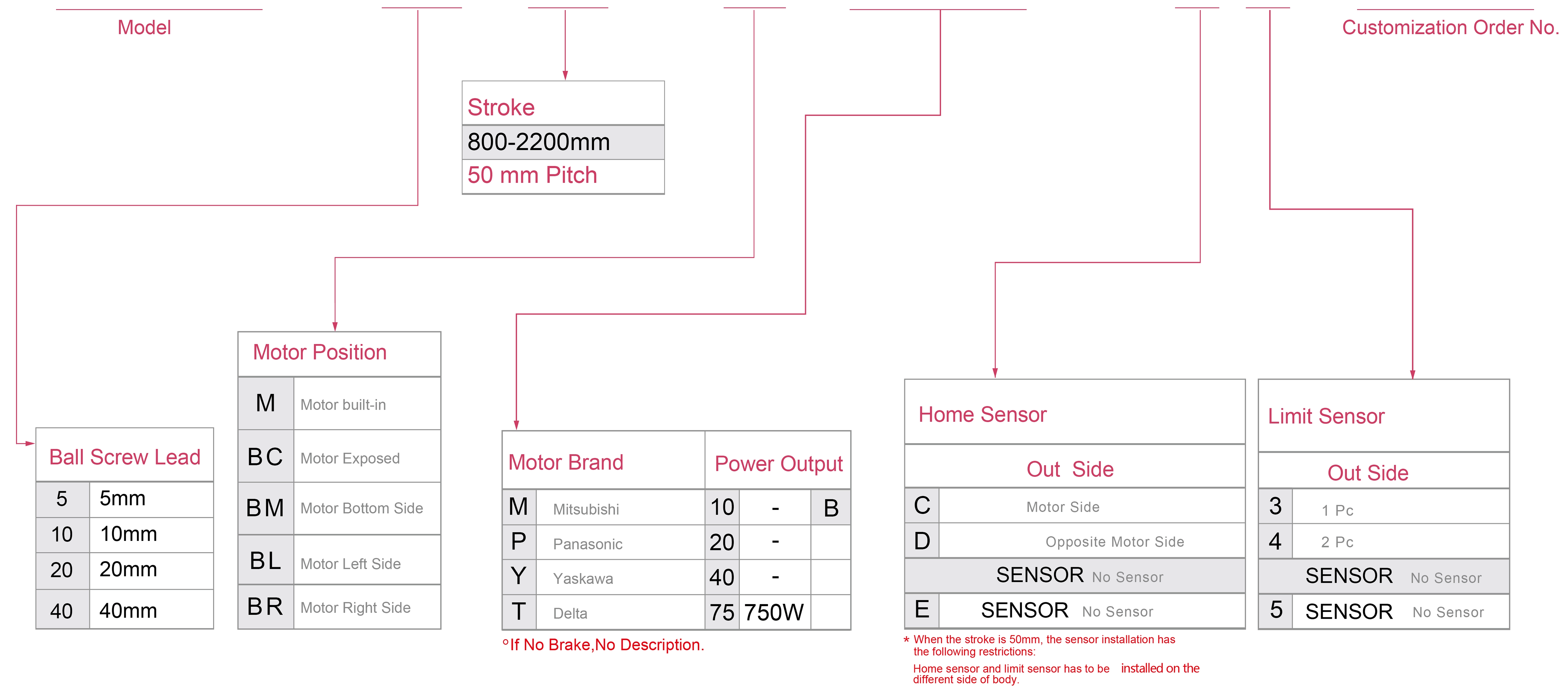 | Gunakan Di Mana | Mod Dipacu | Spesifikasi Model | Output Motor (w) | Lebar (mm) | Kebolehulangan (mm) | Spesifikasi Skru Bola | Muatan Maksimum (kg) | Kelajuan maksimum (mm/s) *1 | ||