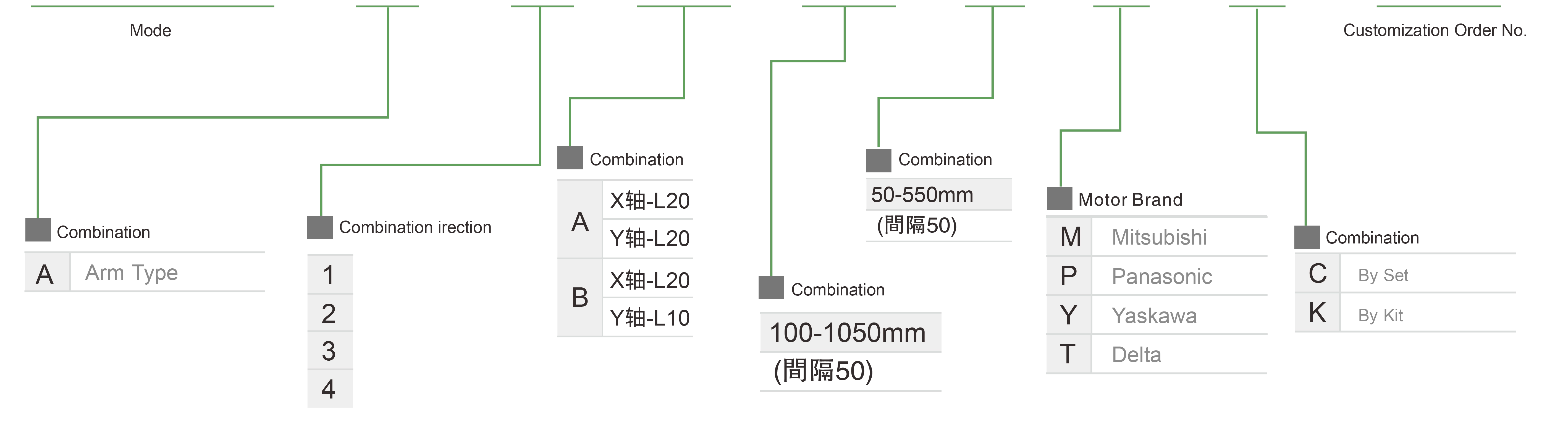 | Gunakan Di Mana | Mod Dipacu | Spesifikasi Model | Gabungan | Nombor Paksi | Plumbum | Kelajuan maksimum (mm/s) | Strok (mm) | ||||||