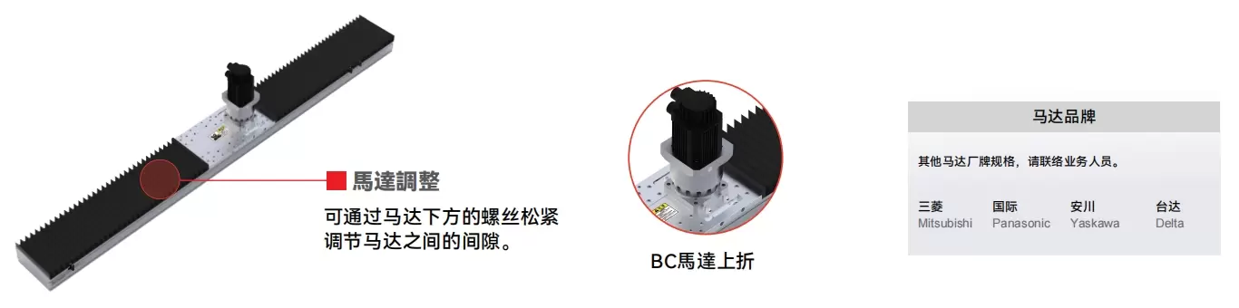 Dengan perlindungan tali pinggang keluli, ia dapat menghalang objek asing daripada jatuh terus ke dalam meja gelongsor. Lejang maksimum di dalam meja gelongsor boleh mencapai 1500mm. Kedudukan pemasangan motor berbilang arah tersedia untuk dipilih, menjadikan reka bentuk mesin lebih fleksibel. Boleh dipasangkan dengan motor servo daripada pelbagai jenama.