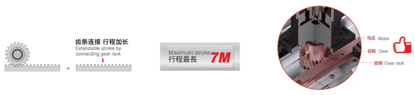 Disebabkan penggunaan pemacu gear, pemacu skru tidak akan berfungsi semasa perjalanan jauh, dan masalah penggulungan skru tidak akan berlaku. Struktur penghantaran dipacu secara linear oleh rak.